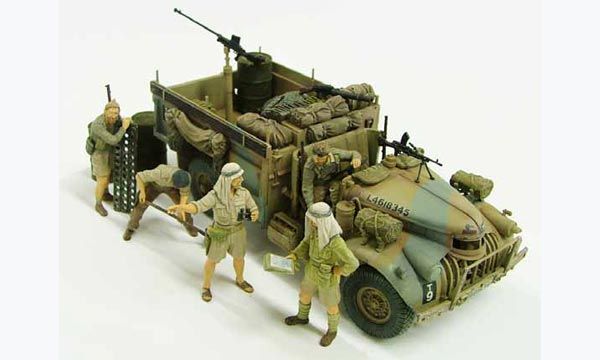 Deze kit combineert de Command Car LRDG Tamiya en een set LRDG-personeelsfiguren in typische Master Box-outfits.
