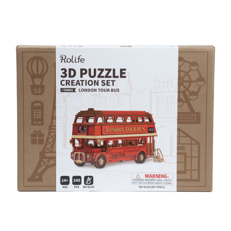 De TGM02 Robotime London Tour Bus is een prachtig houten bouwpakket van Rolife, ontworpen voor volwassenen en kinderen vanaf 14 jaar. Deze iconische rode dubbeldekker rijdt door het hart van Londen, langs bezienswaardigheden zoals St. Paul’s Cathedral, Fleet Street, Aldwych en het levendige Trafalgar Square. Het bovenste deel van deze 3D-puzzel is afneembaar, zodat je het interieur kunt bewonderen, inclusief de gedetailleerde stoeltjes en andere karakteristieke elementen van de Londense toerbus.